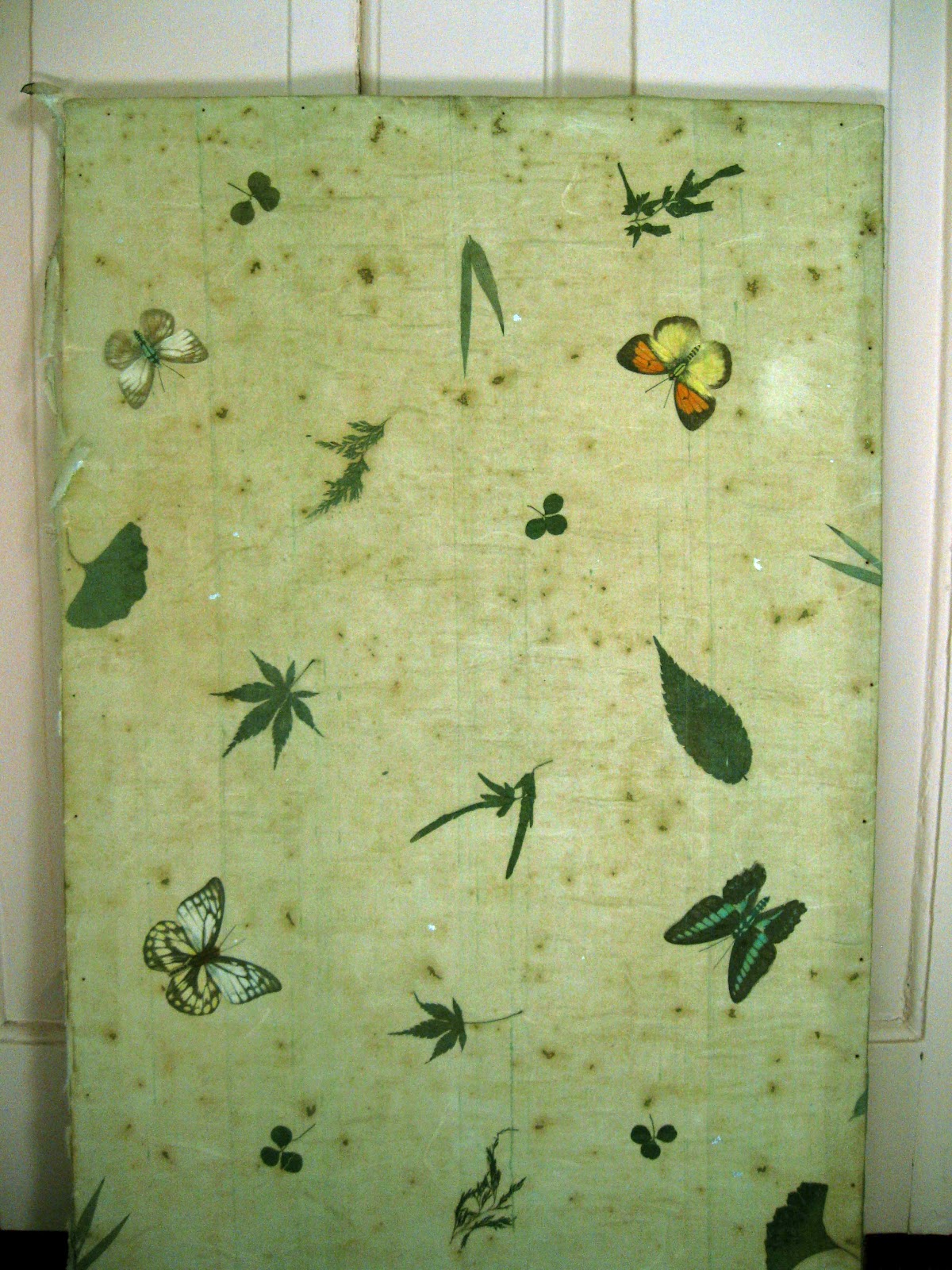Essentially, (deep breath), it is a stretched muslin covered with laminate of a fine paper substrate topped with dried botanical elements and real butterfly wings surmounted by a fine silky gauze top layer. These muslin/paper decorations cover 8 screens that slide across compartments in a built-in wall cabinet. The dimensions of the screens are as follows: